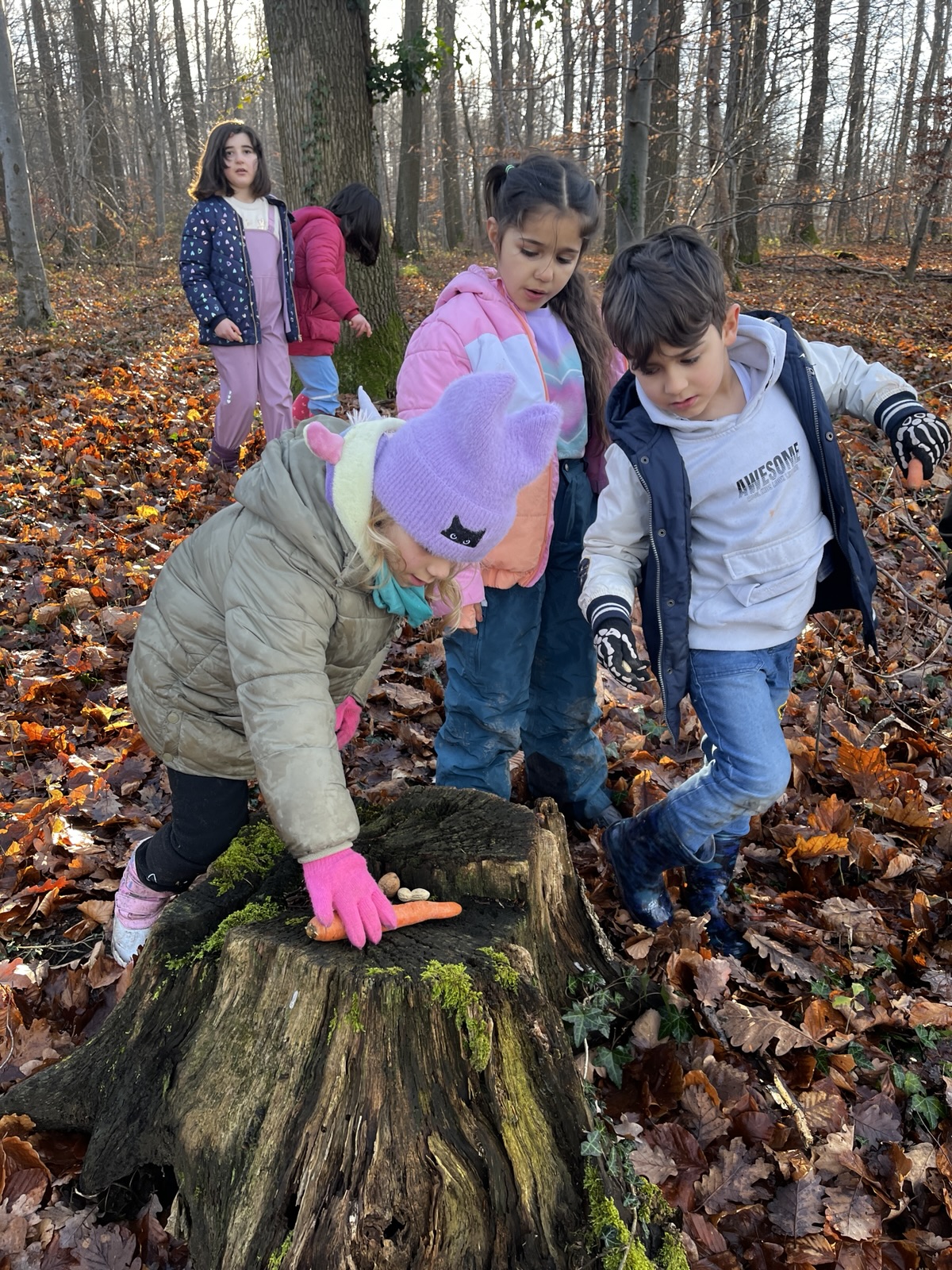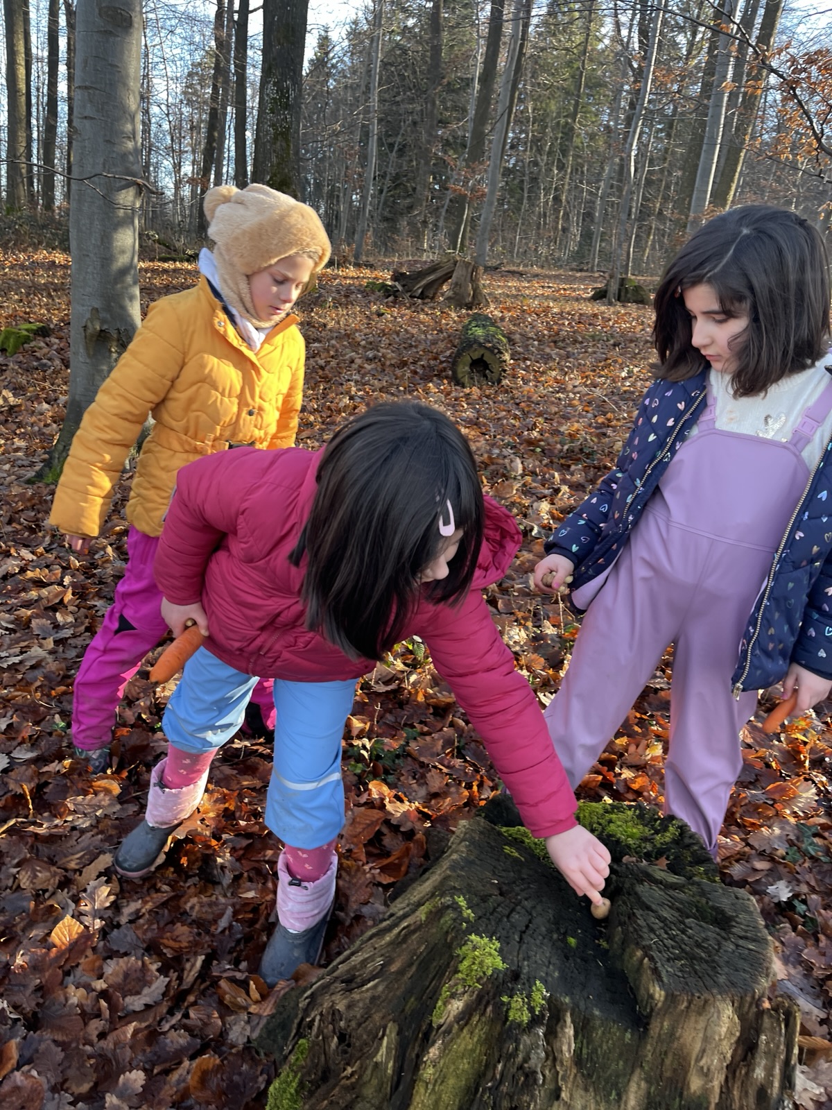 Gerne wollten wir den Tieren eine Freude machen, da wir ja auch Geschenke an Weihnachten bekommen. Wir haben aus gesammelten Stöcken Sterne gebastelt und aufgehängt. Nüsse, Eicheln und Karotten wurden von den Kindern im Wald verteilt und wir hoffen, dass sich die Tiere darüber freuen.